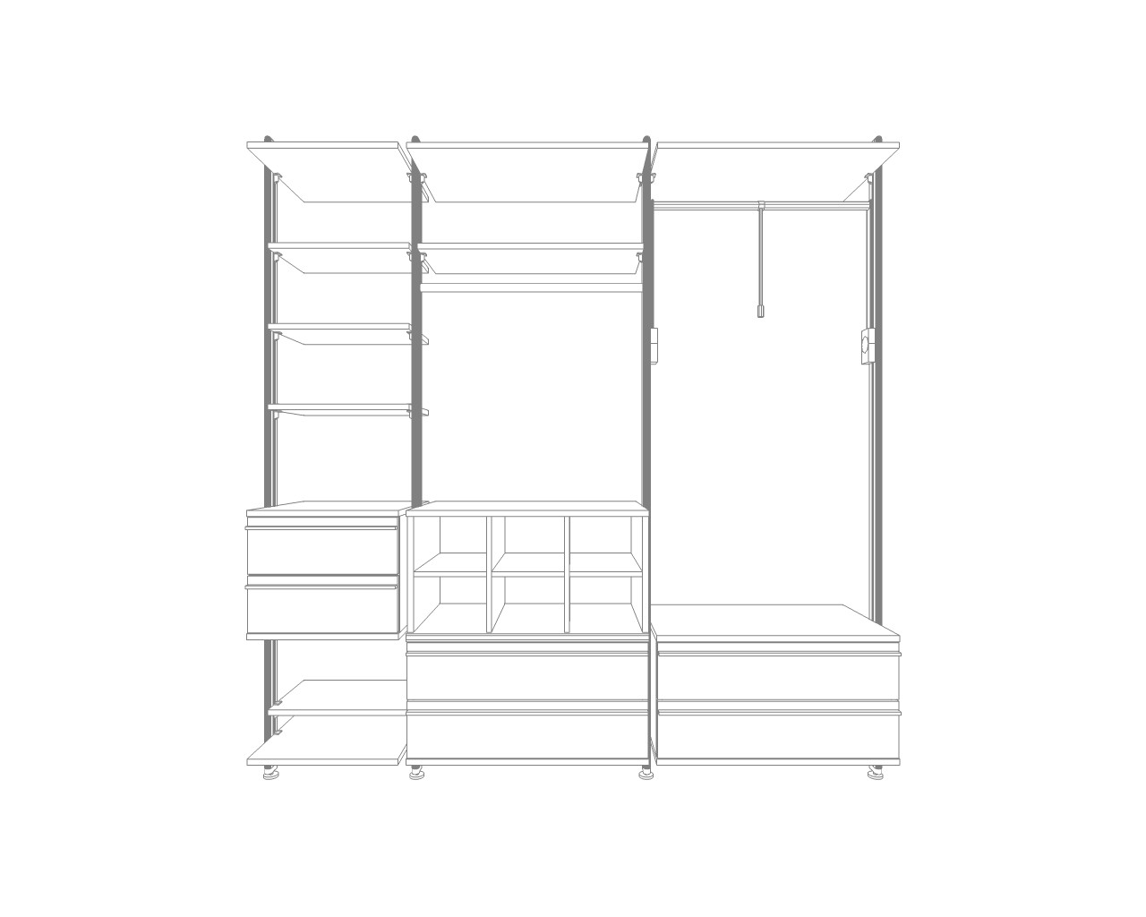 Der begehbare Kleiderschrank verfügt sowohl über viele Schubladen und Ablageflächen als auch über viel Platz für Kleidung zum Aufhängen, Stauraum für Schuhe und Accessoires. Alle Systemelemente lassen sich stufenlos an den Trägerprofilen befestigen. Unsere Schubkastenelemente sind mit hochwertigen Unterflur-Teilauszügen mit Selbsteinzug und Dämpfung ausgestattet. Das Schranksystem kann als begehbaren Kleiderschrank oder als Garderobe genutzt werden. Mit den umfangreichen Systemkomponenten lässt sich der Kleiderschrank jederzeit ergänzen und erweitern. Ihren Gestaltungswünschen sind somit fast keine Grenzen gesetzt.