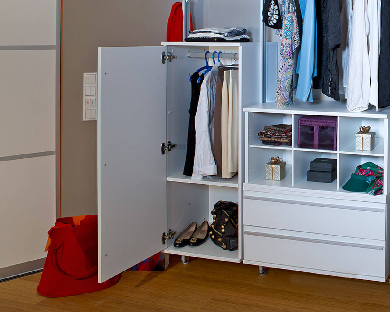 Mit den umfangreichen Systemkomponenten kann der Kleiderschrank jederzeit ergänzt werden. Ihren Gestaltungswünschen sind somit fast keine Grenzen gesetzt.