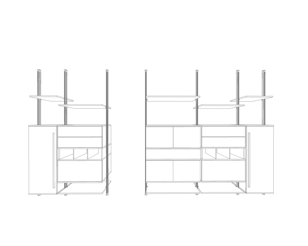 Die einzelnen Funktionselemente wie Böden, Kleiderstangen und Kleiderlifte sowie Schubladenschränke lassen sich stufenlos an den Trägerprofilen befestigen. Alle Schubkastenelemente sind mit hochwertigen Unterflurauszügen mit Selbsteinzug und Dämpfung ausgestattet.