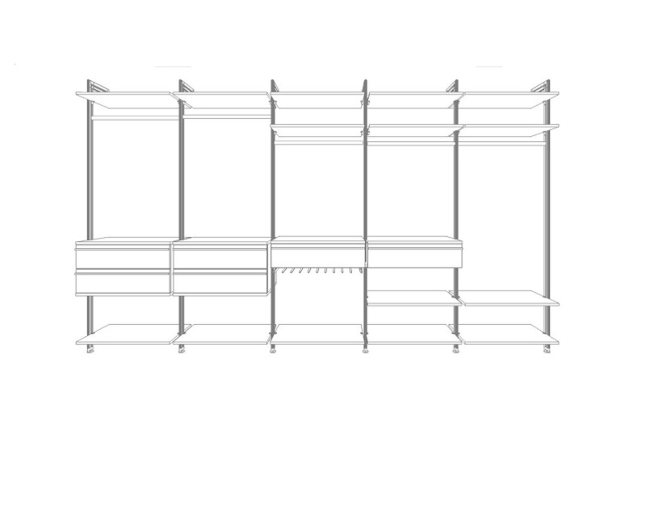 Sie bietet ausreichend Ablagefläche für liegende Garderobe, hängende Garderobe in unterschiedlichen Hängehöhen, einen ausziehbaren Hosenhalter sowie viele Schubladen für Unterwäsche, Strümpfe u.s.w. Sollte das noch nicht ausreichen, lässt sich das Schranksystem Ihren Wünschen anpassen und erweitern.