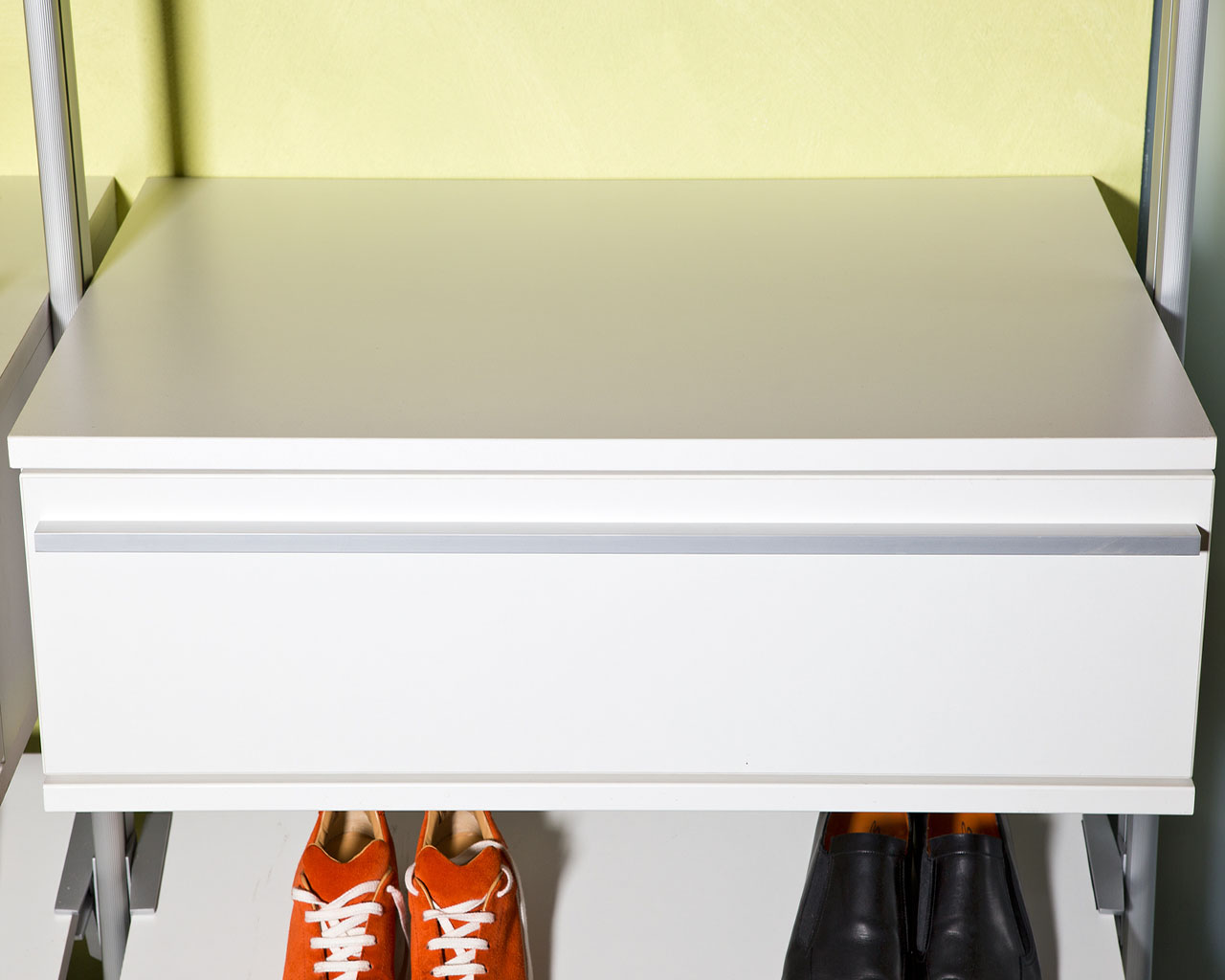 Die Schubladen sind mit hochwertigen Unterflur-Teilauszügen mit Selbsteinzug und Dämpfung ausgestattet. Auf Wunsch können die Schränke auch mit einem Vollauszug ausgestattet werden. Alle Systemelemente lassen sich stufenlos an den Trägerprofilen befestigen. Das offene Schranksystem ist jederzeit mit unseren Schrank- und Funktionselementen beliebig erweiterbar.
