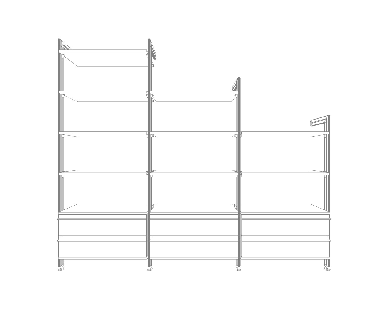 Alle Funktionselemente wie z. B. Böden und Schubladenschränke lassen sich stufenlos an den Trägerprofilen befestigen.