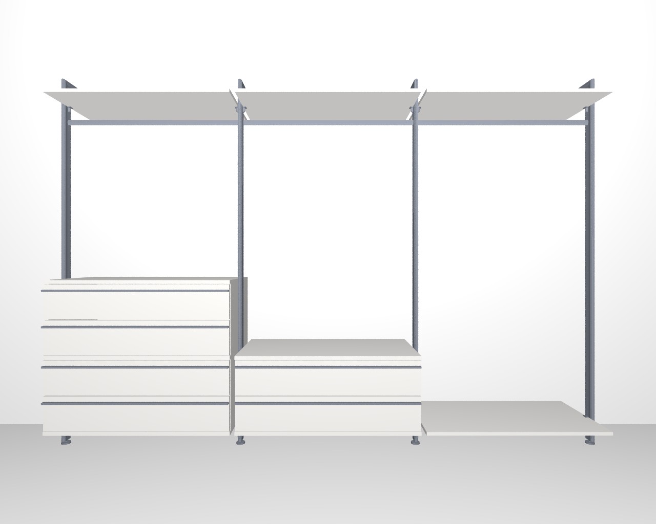 Dieses offene System bietet Platz für Kleidung, Schuhe und Accessoires und kann später durch weitere Elemente ergänzt werden - ideal für begehbare Ankleidezimmer oder breite Schlafzimmerwände.