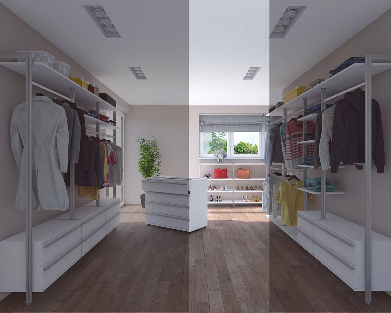 Die zwei Seiten des Systems mit ausreichend Schubkästen werden ergänzt durch ein halbhohes Schuh- und Taschenregal, das mit Böden ausgestattet ist, die individuell angeordnet werden können.