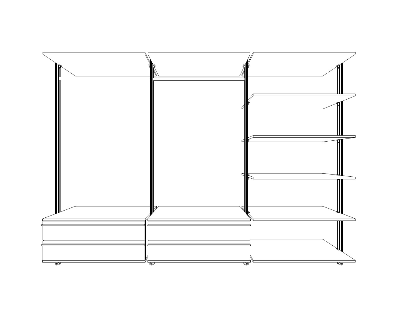 Die Elemente des Boden-Wand-Systems lassen sich beliebig an den Trägerprofilen befestigen. Alle Schubkastenelemente sind mit hochwertigen Unterflurauszügen mit Selbsteinzug und Dämpfung ausgestattet. Der ausziehbare Hosenhalter bietet Platz für 9 Hosen.