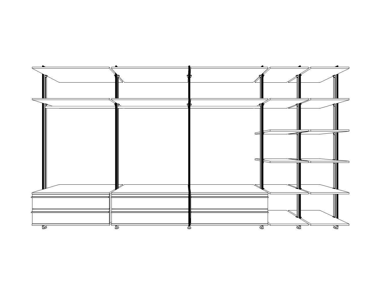 Die Funktionselemente wie z. B. Böden und Kleiderstangen lassen sich stufenlos an den Trägerprofilen befestigen. Alle Schubkastenelemente verfügen über langlebige und hochwertige Unterflurauszüge mit Selbsteinzug und Dämpfung.