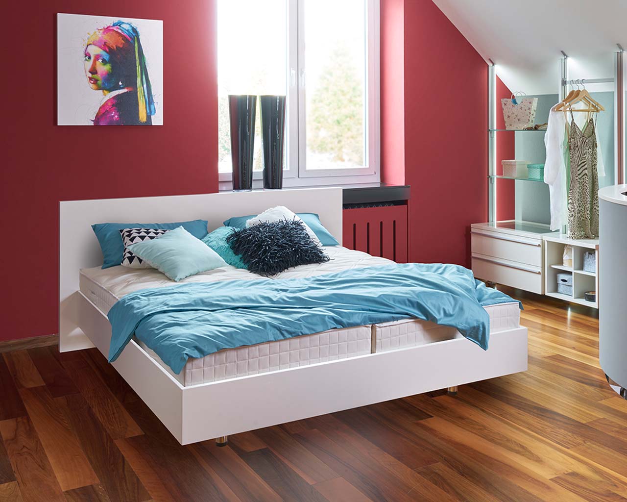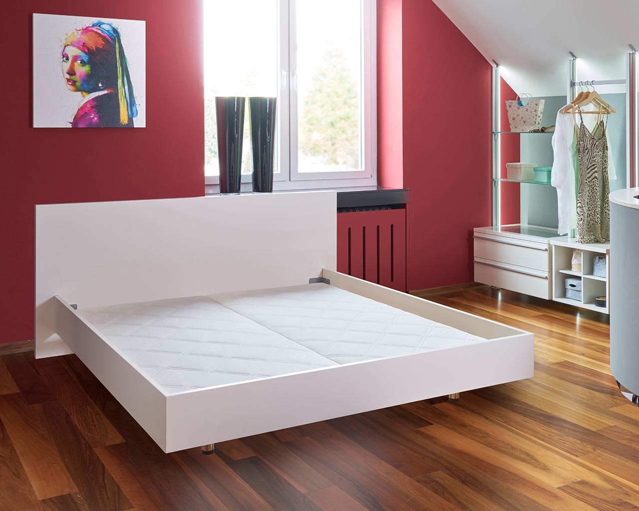 Schlafzimmer Kleiderschrank inkl. Doppelbett bestehend aus unserem offenem Kleiderschrank SYLT und unserem hochwertigen Designbett LACK.