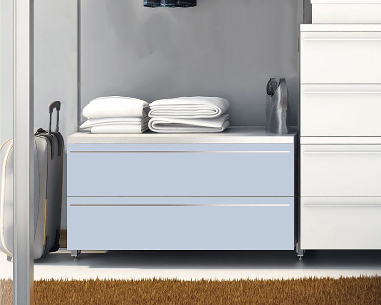 Schrankelement mit zwei Schubkästen in Gletschereis-Blau in Systemtiefe 52,0 cm, und 3 Systembreiten erhältlich.